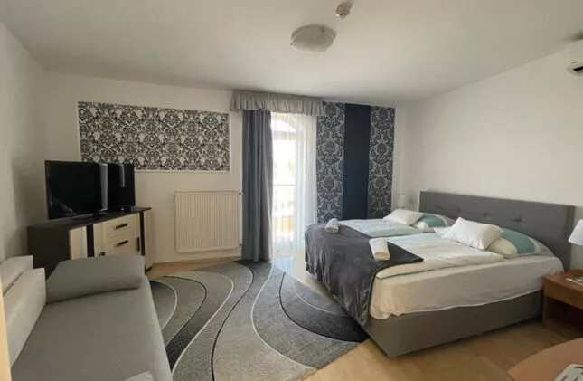 Das neu erbaute ***Hotel steht im ruhigen Stadtteil “Révfalu”. Das Stadtzentrum ist in gemütlichen 15 Gehminuten zu erreichen. Zudem fährt, nur 100 Meter von der Pension entfernt, die Buslinie Nummer 11 alle 15 Minuten für wenige Forint direkt zum Marktplatz der historischen Altstadt.